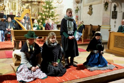 Die Träume der Hirten wurden vom Engel Theresa mit einer Hirtenbotschaft verstärkt, die von der Zither mit der „Weise mit Theresa“ eindrucksvoll unterstützt wurde. Die erstaunten Hirten luden die Besucher dann ein, mit ihnen zur Krippe zu kommen, was die Bläser mit dem aufrüttelnden „Quem pastores laudavere“ unterstrichen. „Tauet Himmel den Gerechten“ hieß es dann beim Viergesang, eine Botschaft die der Sprecher mit seinen Schlussgedanken und der Bitte „Gloria in excelsis deo – Herr mach unsere Herzen weit“ ebenso vertiefte wie die „Ruperti Weis“ der Zither. Und danach stand der Dreigesang bereits mit dem Wiegenlied „Büabale, Liabale“ an der Krippe.
